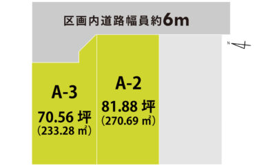 A-3:70.56坪にそのまま建てられる平屋参考プランをご用意。 該当の分譲地はいずれも、人気の平屋や大きな庭付きのご計画にもぴったりの住宅用地です。 ※プランは一例です。お客様が自由に決定できます。